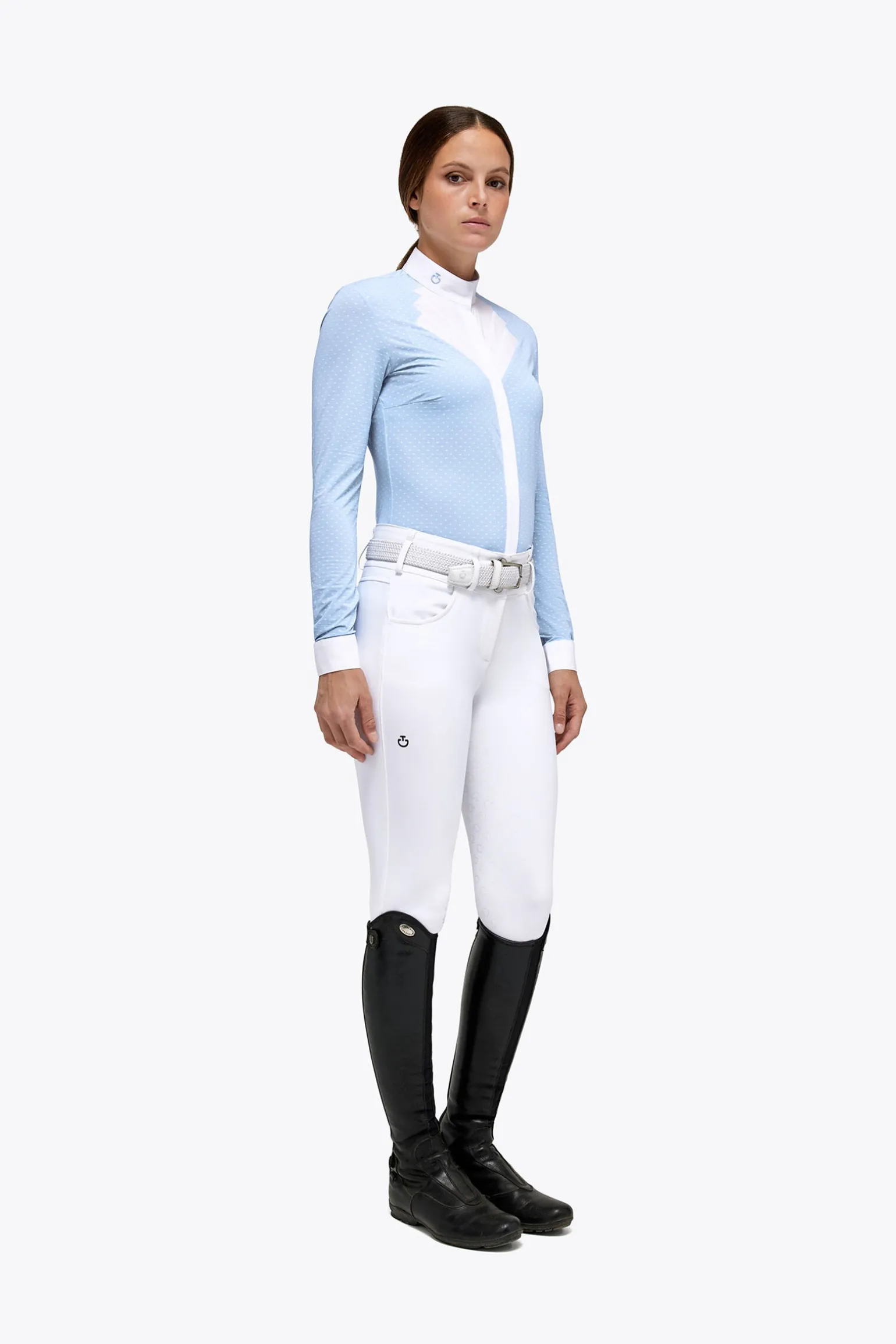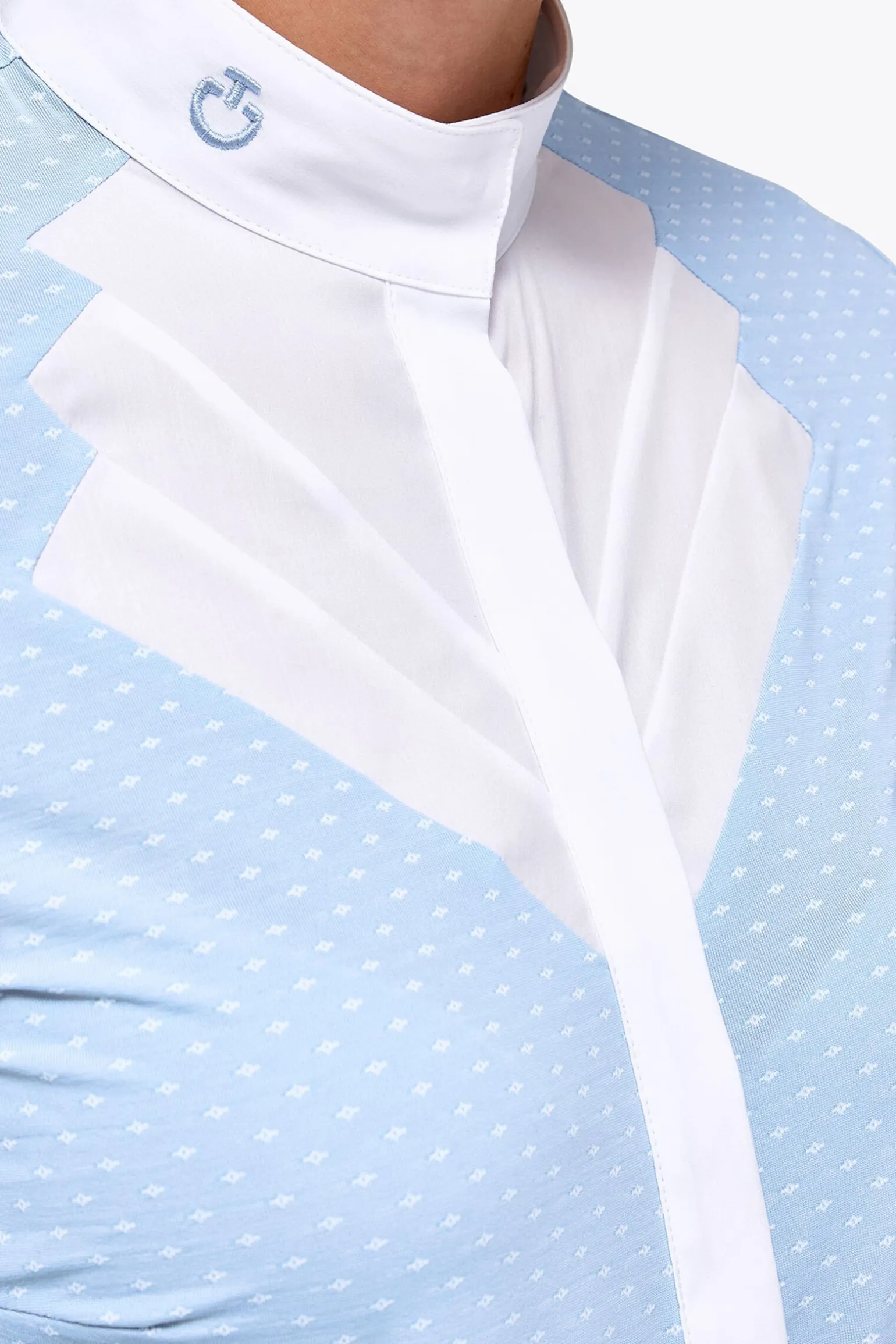 Dame Hunter-skjorten med lange ermer har en høy poplinkrage og en vifteformet front med plissert detaljering og skjulte knapper. Denne stevneskjorten er laget av et svært pustende bi-stretch teknisk stoff som sitter perfekt til kroppen og følger bevegelsene dine. Det er et lite logo på kragen.