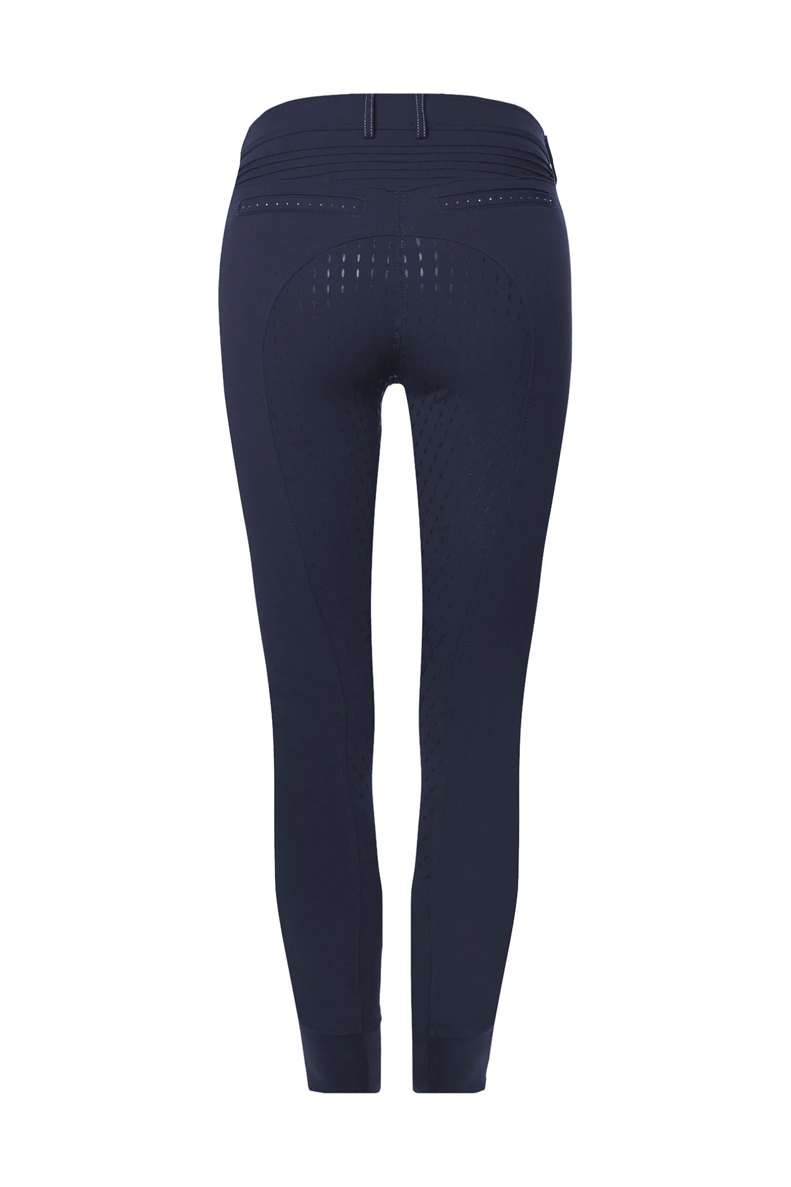 Sporty breeches with sparkling details. Two comfortable pockets at front, on right side additionally with subtle two coloured zip. Fake welt pocket on back and Cavallo logo made of sparkling cut metal nailheads. Through special construction seamless knee area. Worked in pin tucks on back pants ensure special fit of waistband. Extremely soft, perfectly gripping silicone grip.