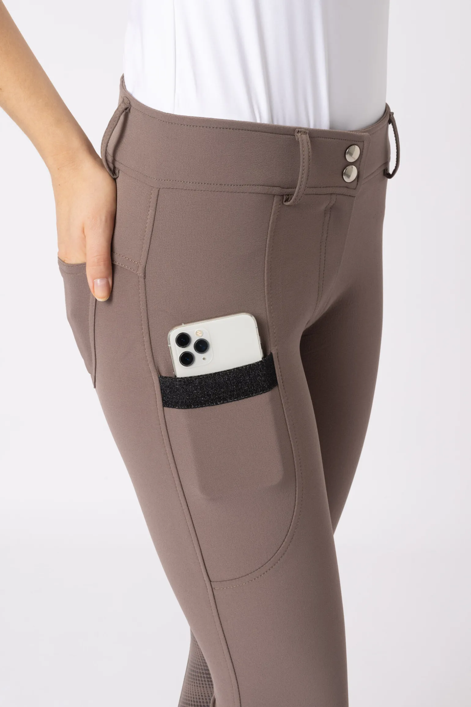 Disse helforsterkede ridebuksene i nydelige farger kommer med et høyt liv som holder dem på plass.En praktisk lomme på låret passer på telefonen din.Elastiske ben nederst passer perfekt i dine favoritt-ridestøvler.Bruk dem med et belte og treningsskjorten din, og ingenting vil stoppe deg!