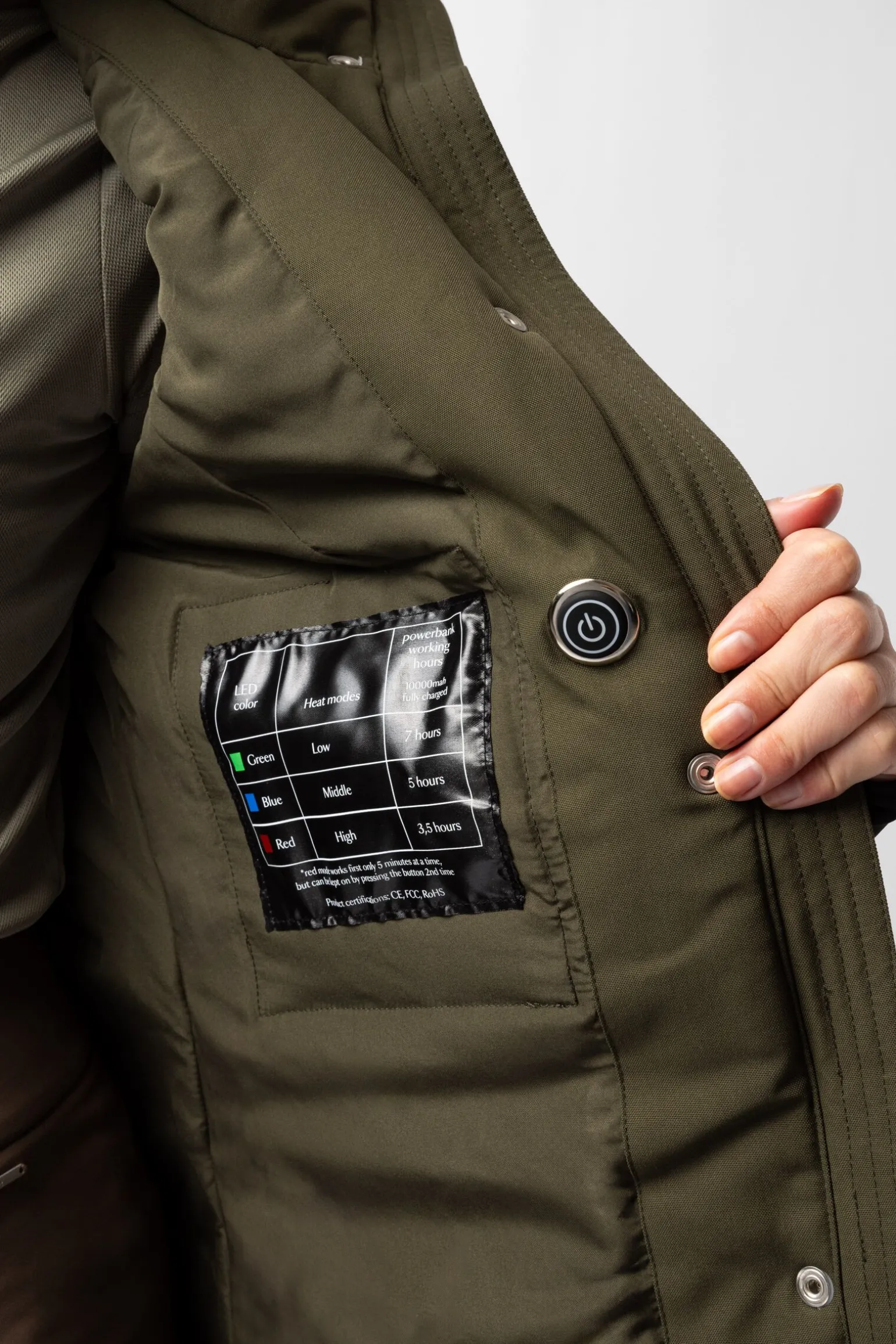 - Oppladbare varmepaneler på innsiden (tre varmenivåer)