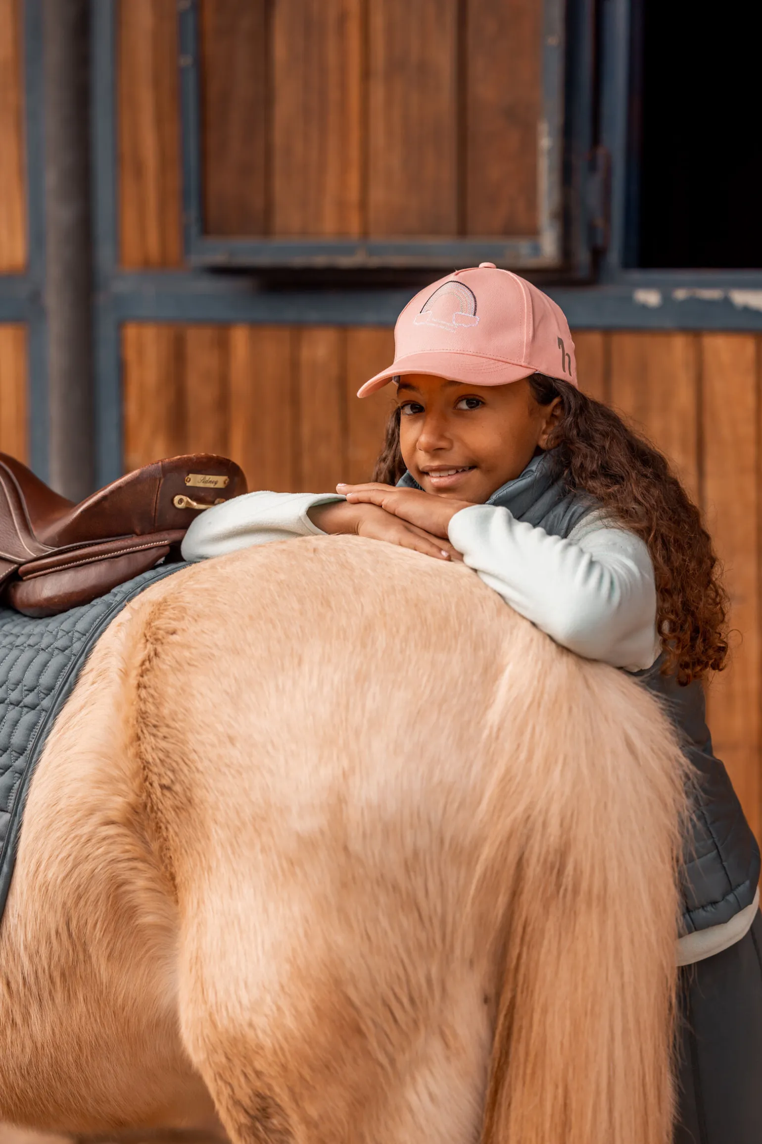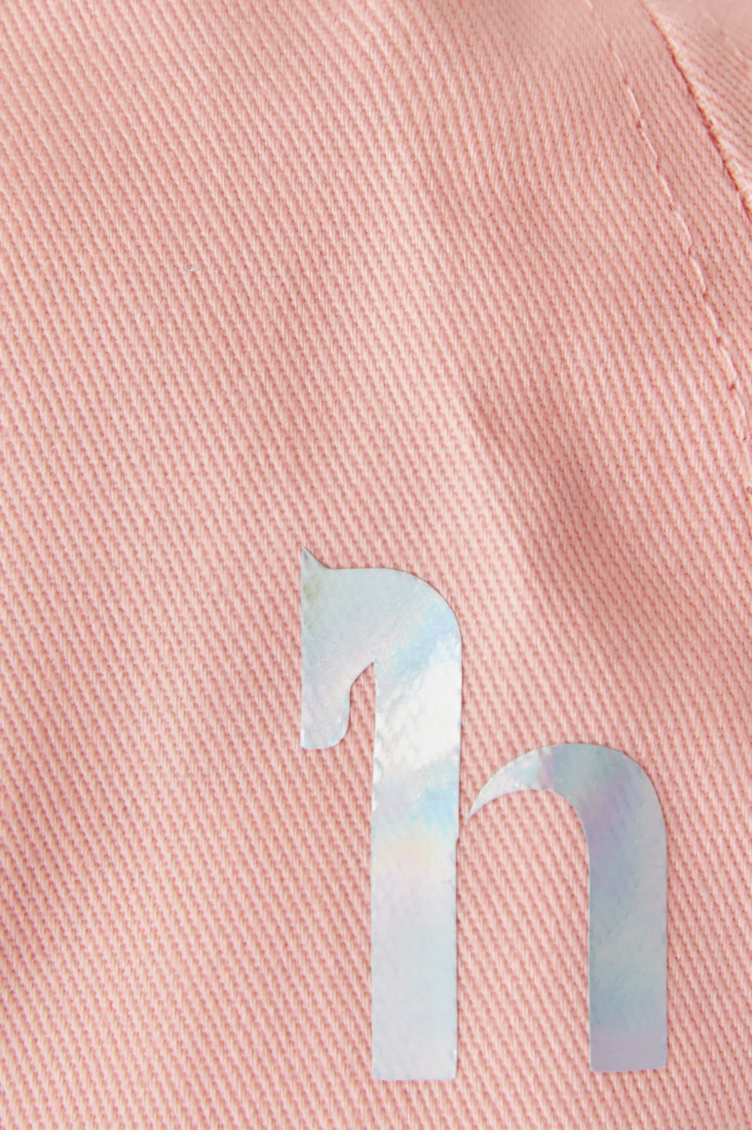 En fin beskyttelse mot sola, med supersøtt broderi foran, og en liten holografisk ‘h’ på siden.Det er brodert «I find happiness in rainbows and horses», og capsen er sydd i pastellfarger.