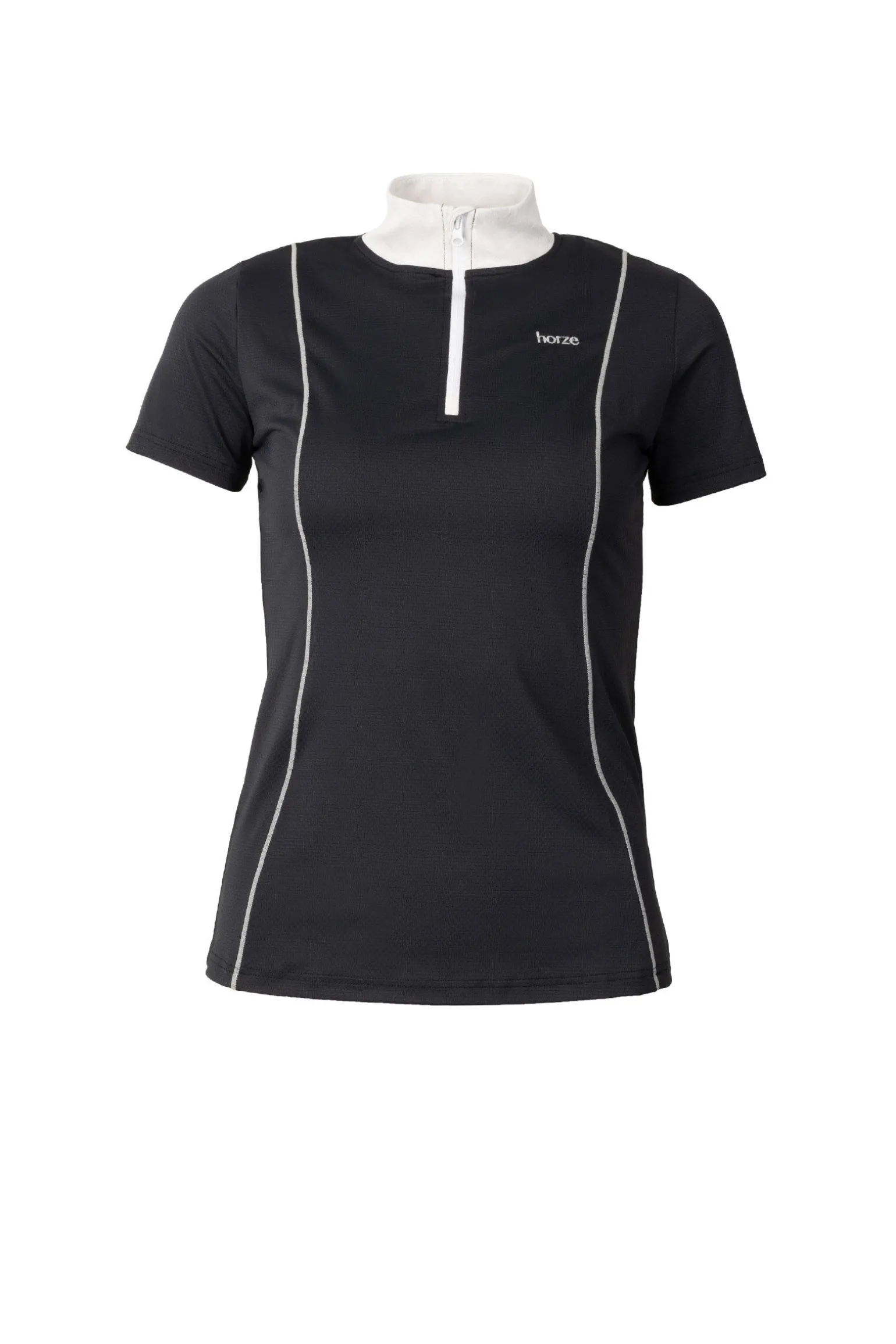 - Lett sommerstoff. Pustende. Elastisk. Hurtigtørkende. Mesh-innlegg på siden. Logodetaljer på venstre bryst. Halv glidelås. Stående krage