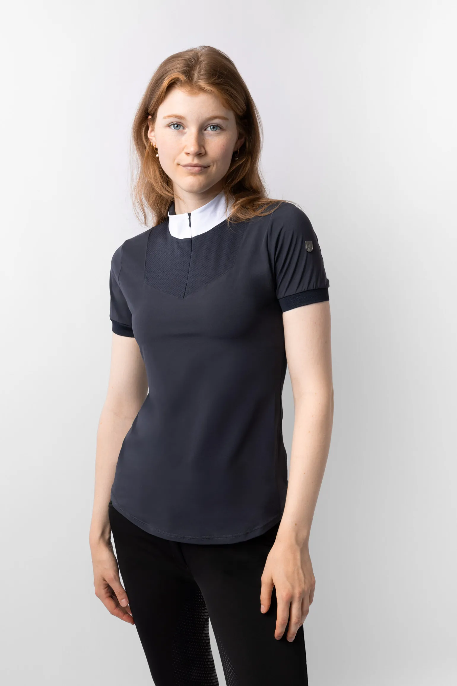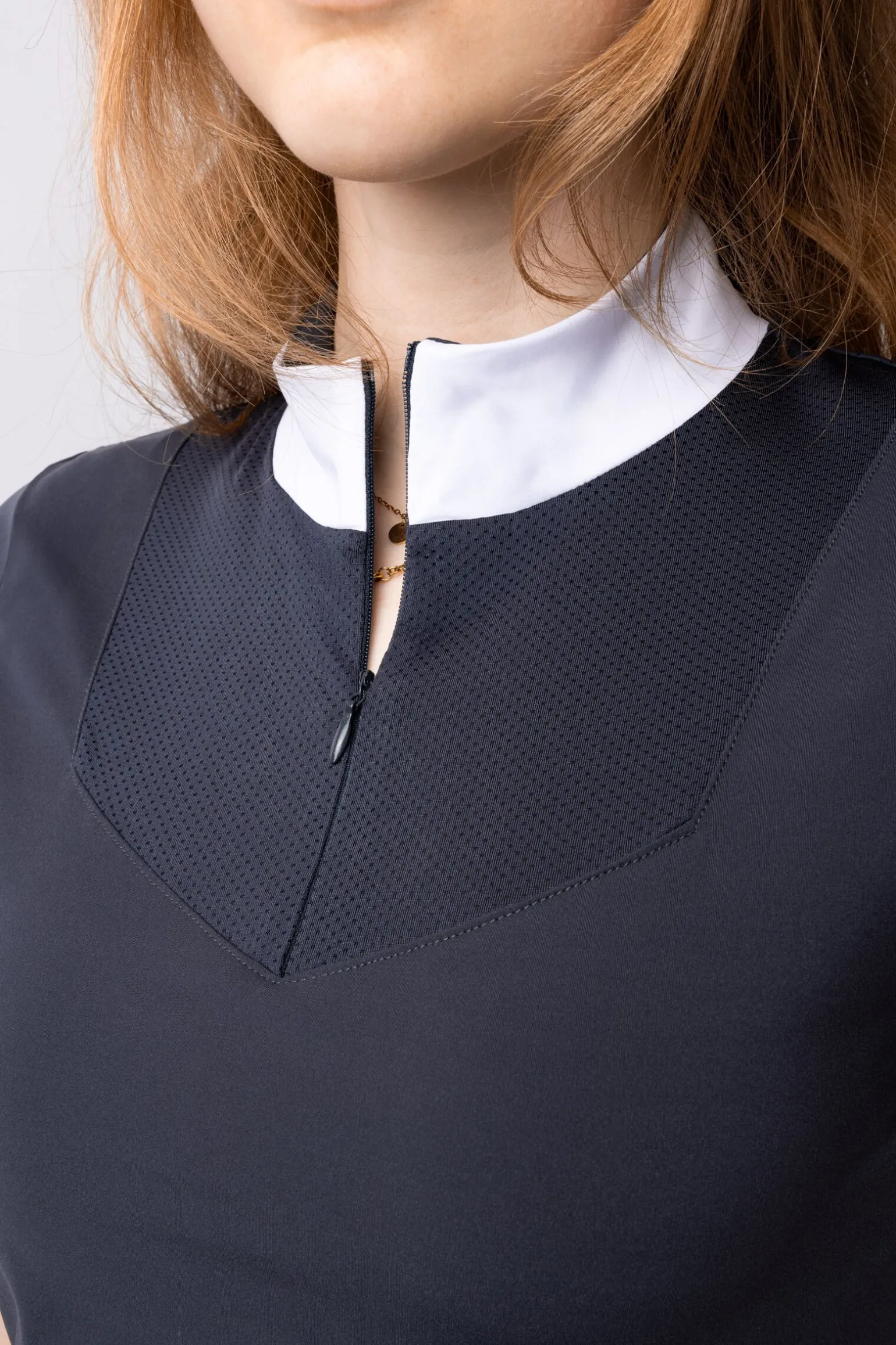 Kragen på denne nydelige stevneskjorten er ideell å bruke under konkurranse, men kan også glides ned slik at skjorta kan brukes under vanlig trening. Nettingstoffet på brystet og ryggen gir ekstra luftgjennomstrømning for maksimal funksjonalitet. Glidelåsen er enkel å bruke og gir deg muligheten til å endre raskt. Formen er sporty, men feminin og passer til flere ulike sammenhenger. Stoffet er mykt, men holdbar, noe som gjør det ideelt for aktive ryttere.