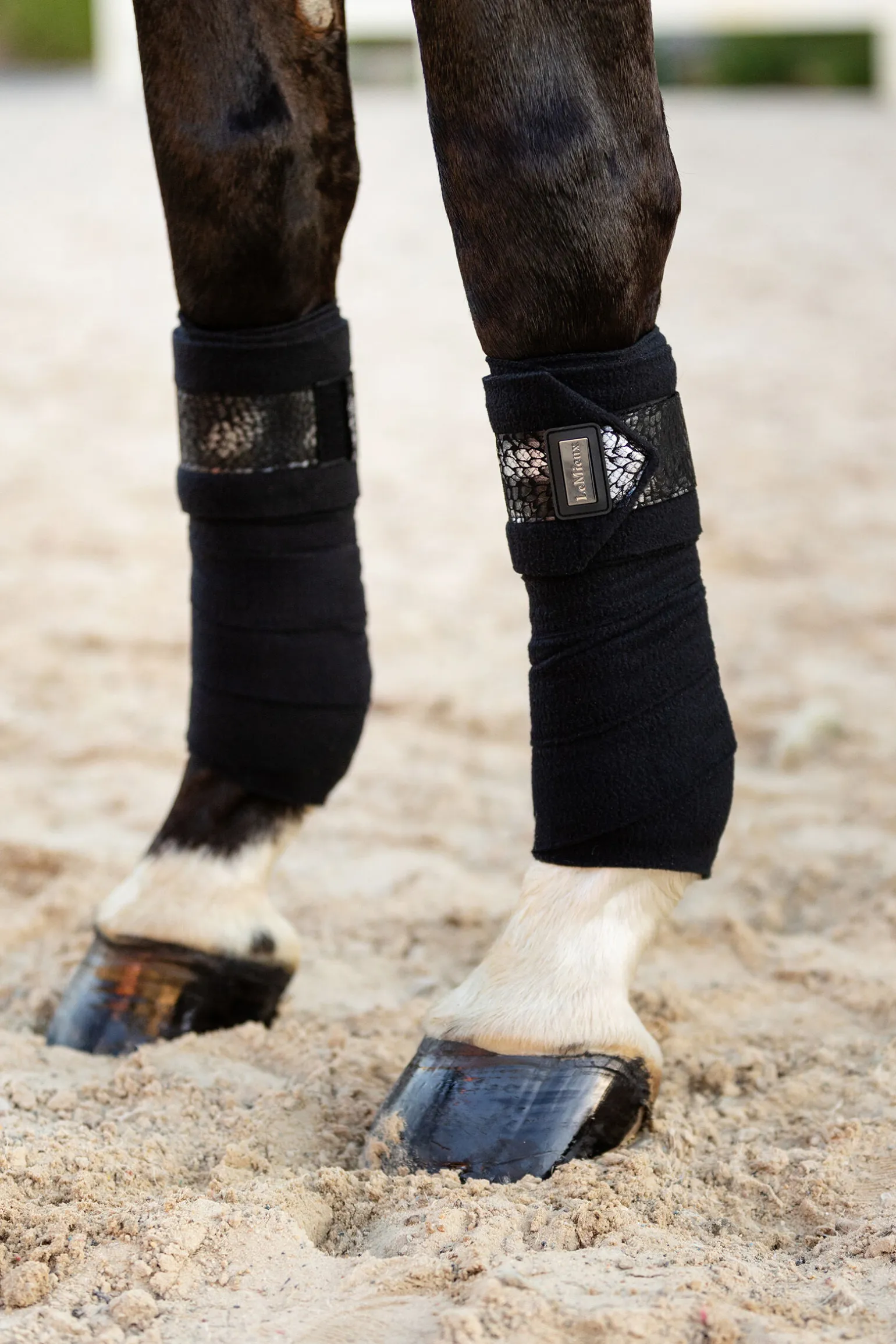 De har en metallisk endedetaljfane med matchende metallisk trykk og merke, og de vil forbedre utseendet ditt samtidig som de gir hesten langvarig støtte mens du rir. Du kan bruke disse bandasjene alene eller med LeMieux underbandasjeputer for ekstra beskyttelse.