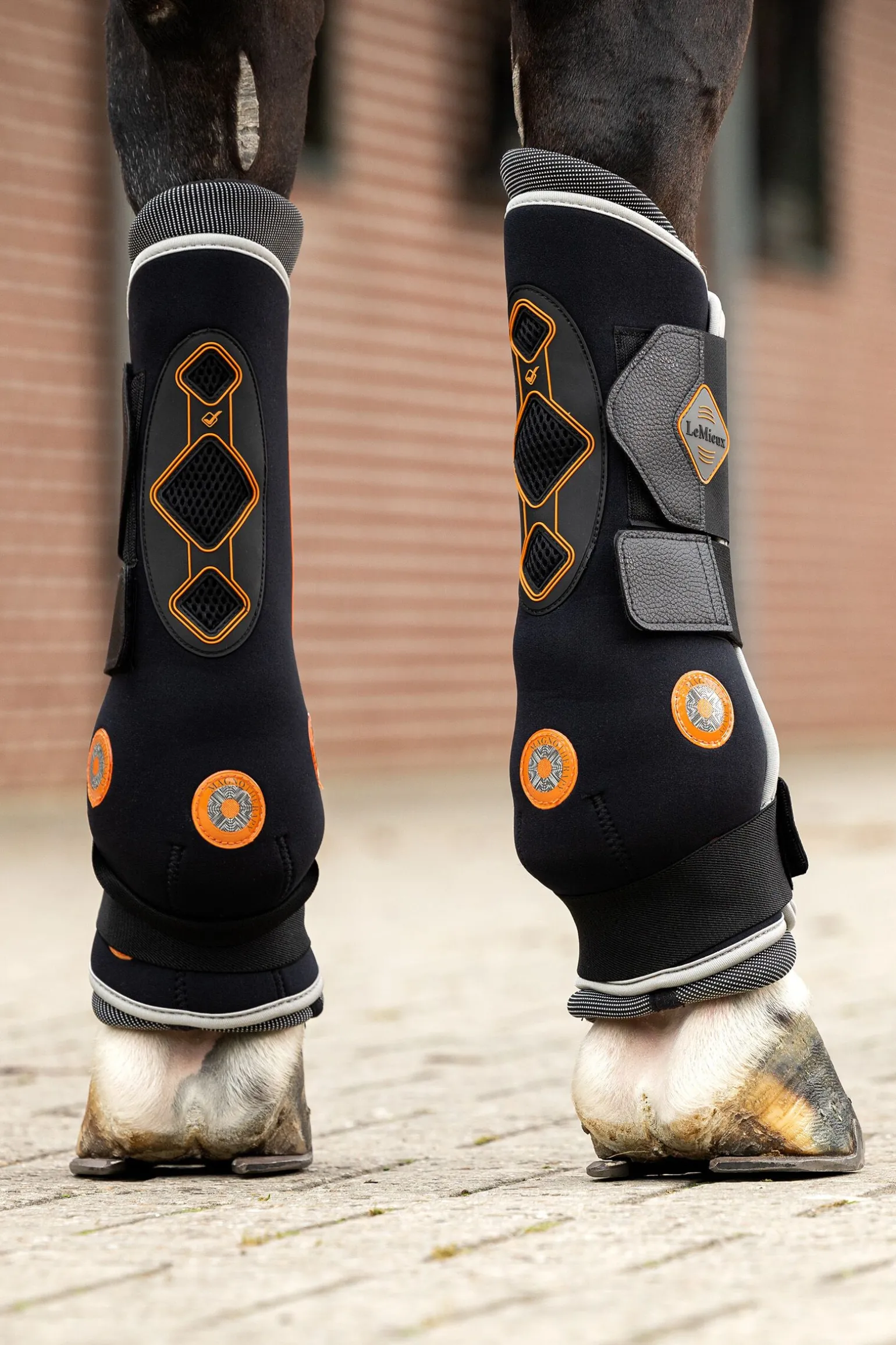 Conductive Magno Boots er en ny generasjon magnetiske beinskjold. Unike indre foringer inneholder et vevd lag av stålfibre direkte under 18 kraftige 2600 gauss neodymmagneter. Stålfilamentene leder de magnetiske bølgene jevnt rundt fôret, og bringer hele benet innenfor det magnetiske feltet. Dette unngår uønskede varme punkter fra de enkelte magnetene og forbedrer den totale effektiviteten.Mesh bakventiler slipper ut overflødig varme skapt av det magnetiske feltet, og et ytre lag av bambus sikrer god fukttransport. Dette kombinert med den jevne spredningen av magnetiske bølger skapt av de spesielle foringene, gjør at Conductive Boots kan brukes over lengre perioder.Bygg alltid sakte opp bruksperioden for støvlene slik at individuelle hester kan venne seg til dem. Søk alltid profesjonell veterinærråd. Bruken av magneter er bredt anbefalt av veterinærer og trenere for sine fordeler. Kan også brukes til vedlikehold og er ideell for bruk før og etter trening.