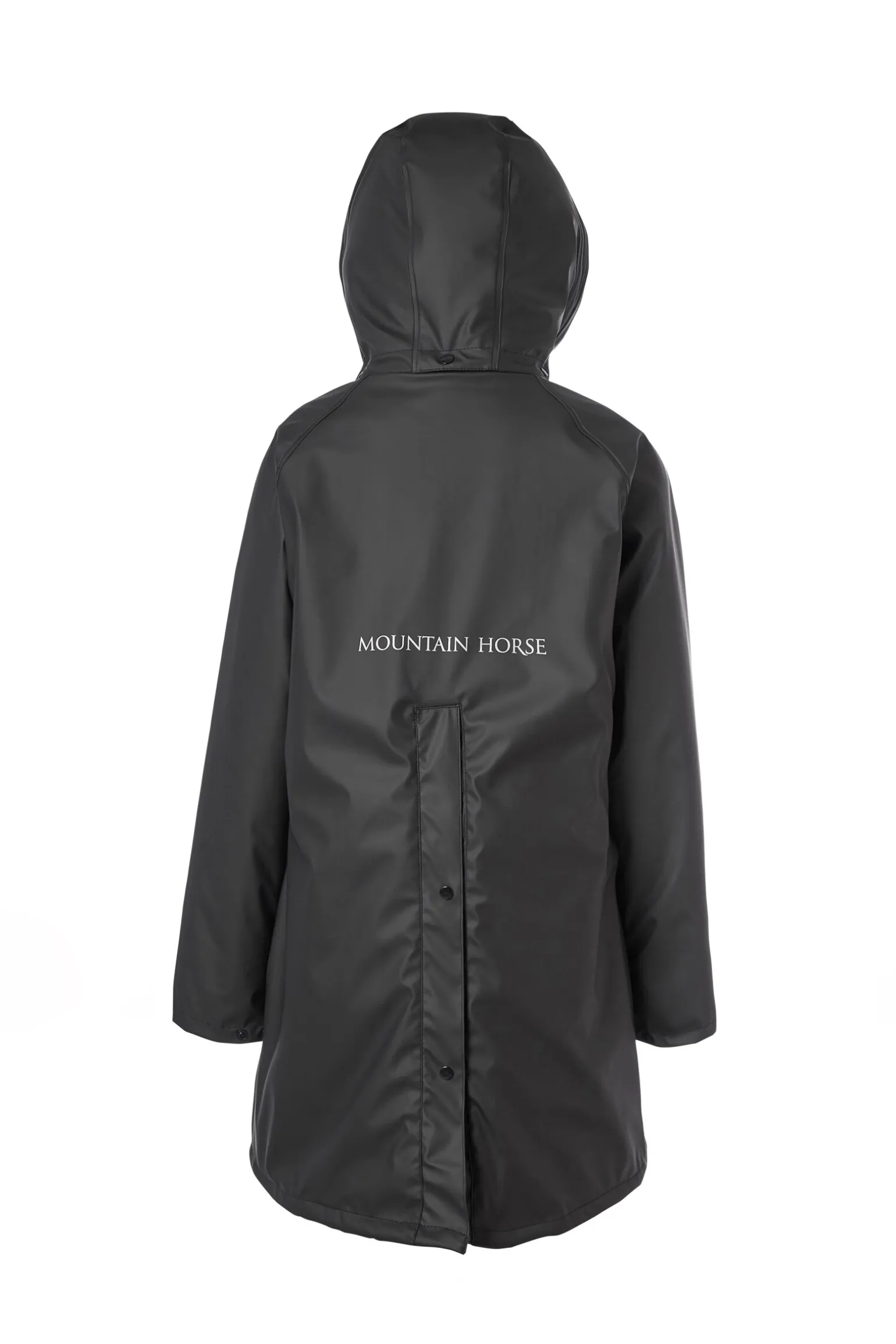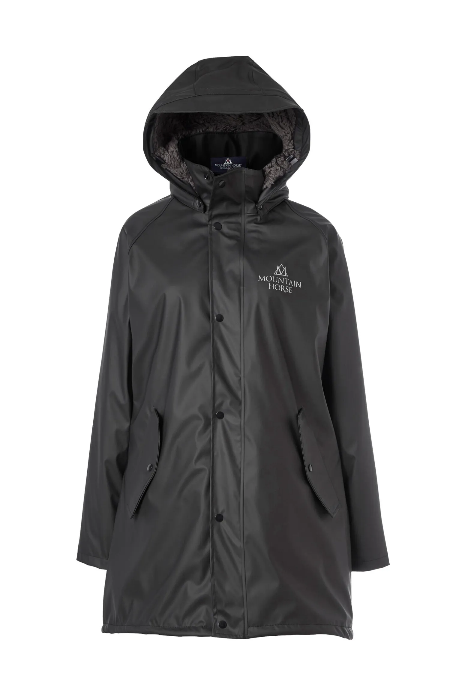 Fully waterproof rain coat with welded seams. Lined with cosy soft pile fabric. Large front pockets, Riding slit at back and reflective details.