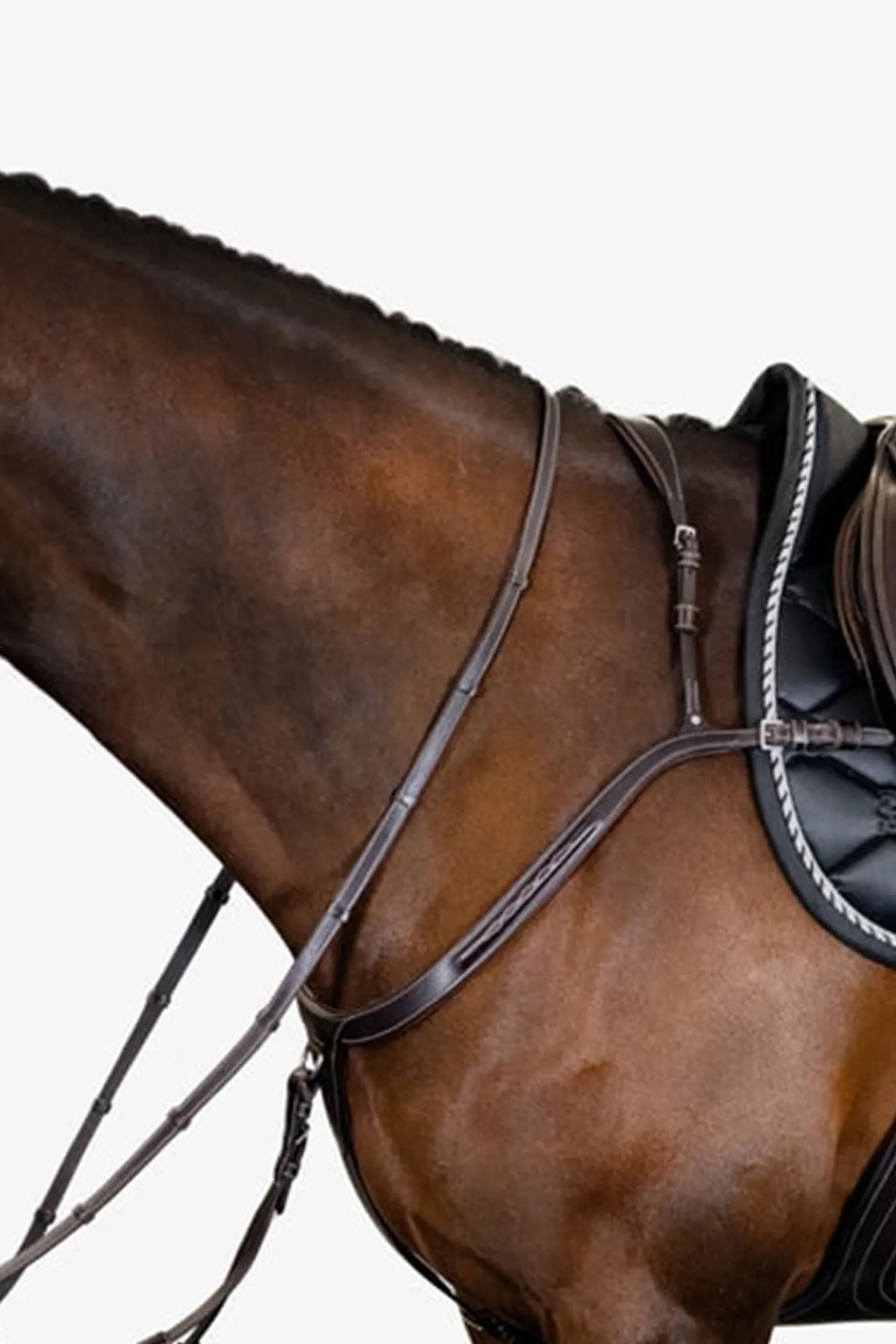 Et luksuriøst og godt utformet fortøy, ekstra bredt og polstret for ekstra komfort. Det har en anatomisk formet kurve som beveger seg rundt hestens skulder uten å begrense bevegeligheten. En praktisk karabinkrok festes til gjorden, og fortøyet er justerbart på begge sider av manken. De smarte Snap It krokene gjør det unødvendig å åpne tøylene for å feste utstyret, noe som er både praktisk og sikkert.