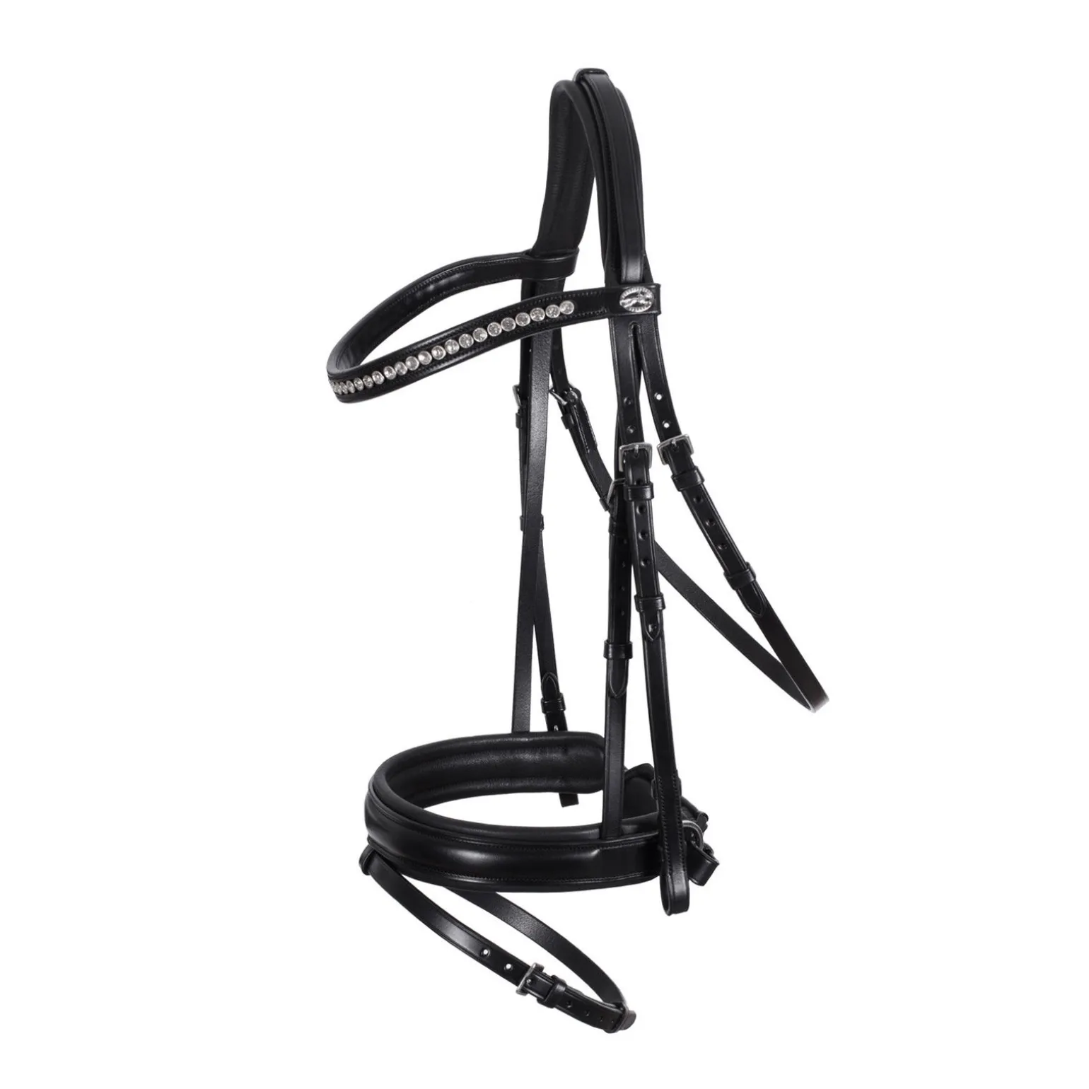 Et absolutt blikkfang – hodelaget Madrid fra Schockemöhle Sports! Takket være den brede, kombinerte spesielle nesereimen og de store krystalldetaljene på hodelaget har dette en optisk attraksjonskraft. Det overbeviser også med det fôrede nakkestykket og rause nesereimen. Rundes av med den nye logoknappen, og du vil være et umiddelbart blikkfang, enten du er på stevne eller ute på tur.
