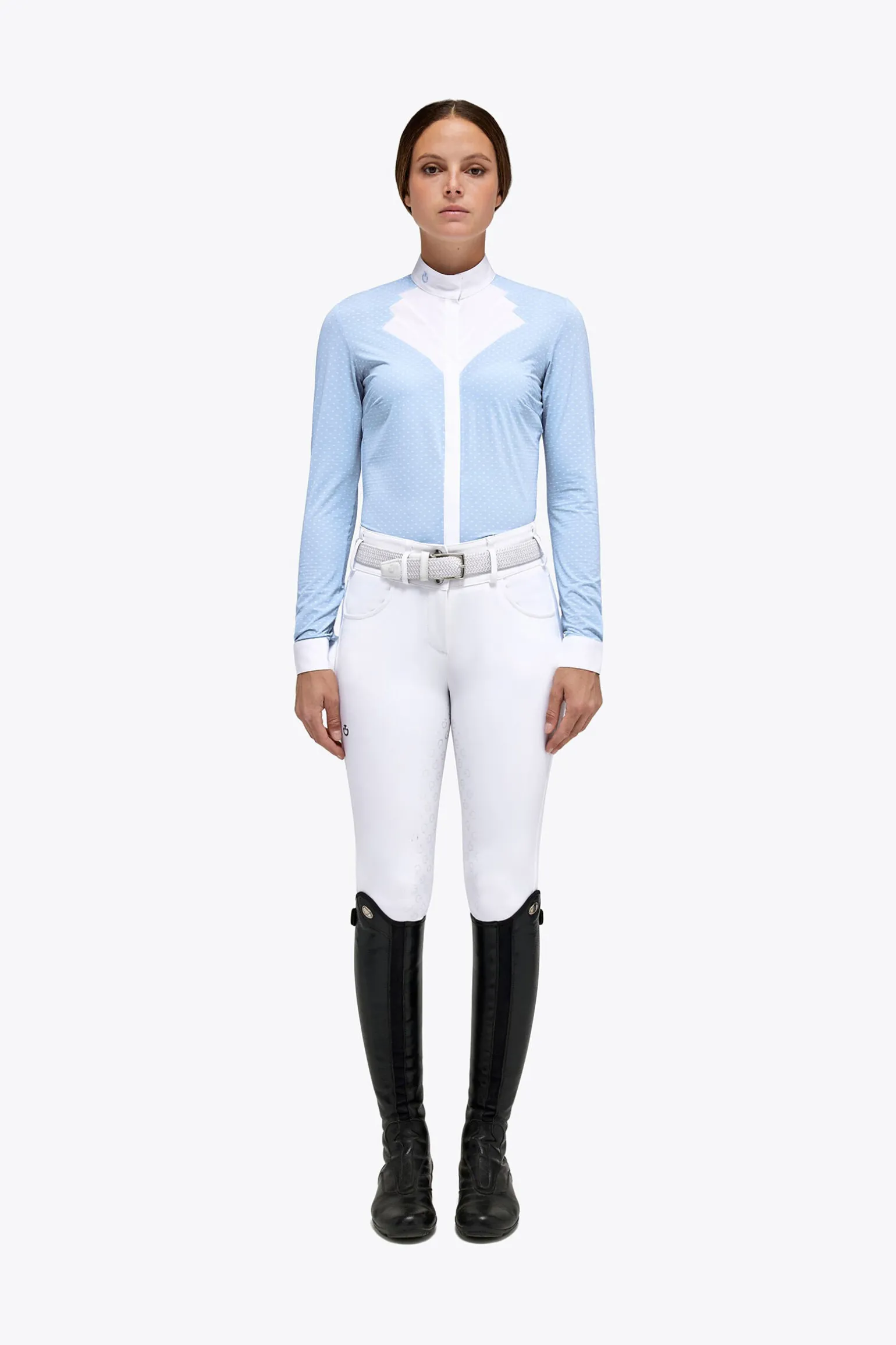 Dame Hunter-skjorten med lange ermer har en høy poplinkrage og en vifteformet front med plissert detaljering og skjulte knapper. Denne stevneskjorten er laget av et svært pustende bi-stretch teknisk stoff som sitter perfekt til kroppen og følger bevegelsene dine. Det er et lite logo på kragen.