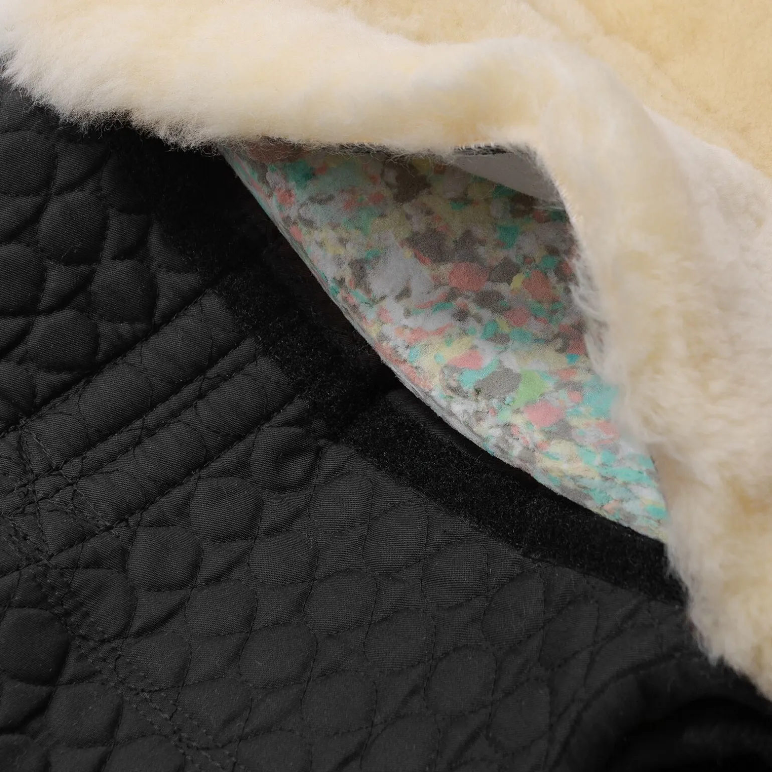 Setet består av ekte saueskinn med en ullhøyde på ca. 30 mm, mens undersiden har saueskinn kun i midtre del, over ryggen. I setet er det lagt inn uttrekkbare polstringer av komposittskum på begge sider av ryggraden. Det øker først og fremt sittekomforten for rytteren, og dernest er det en god beskyttelse for hestens rygg. For å forbedre likevekten, er det mulig å feste stigbøyleremmer i D-ringer, under saueskinnsfellen under setet. Kan vaskes i maskin med spesielt vaskemiddel for sauefell. Tåler også tromling. Vi anbefaler vårt vaskemiddel «C7». Vennligst respekter våre vaskeanvisninger.
