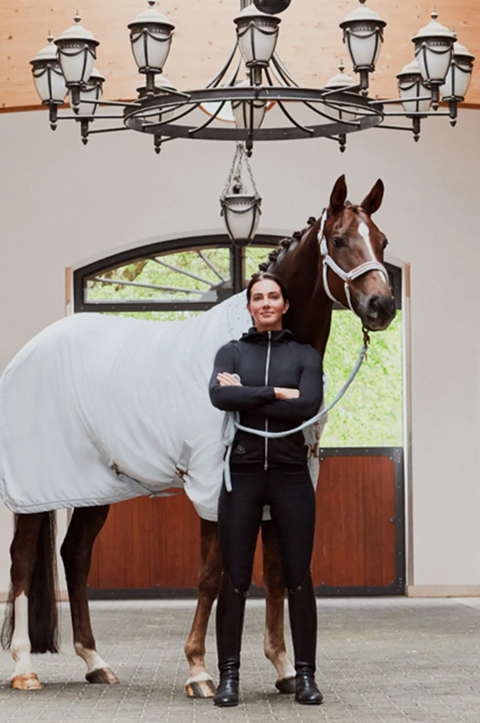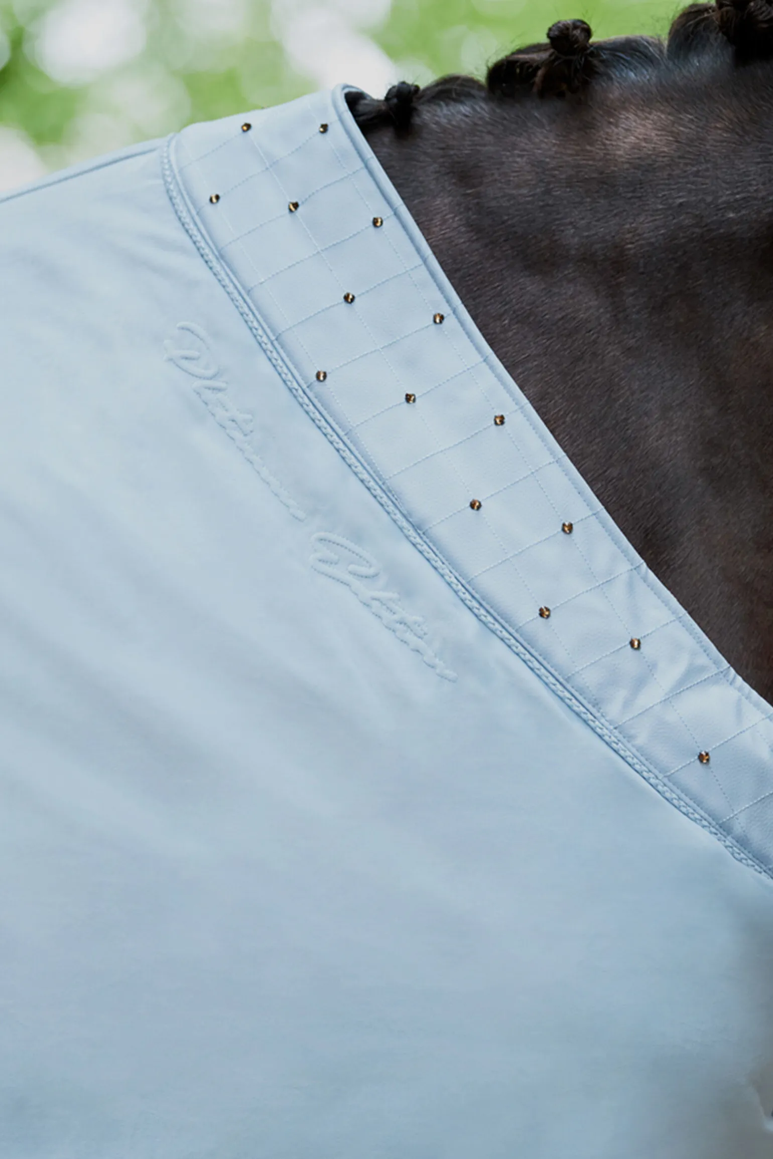 - Overdel i edelt fløyel og lett fleece på innsiden av kunstskinnkrage med innsatte krystaller på begge sider Tone-i-tone imitert skinnsnor Platina-bokstaver i halsen på begge sider Dobbel brystlukking med borrelåsfeste Avtakbare kryssringer på innsiden Integrert halestropp Pustende fuktighet-Wick