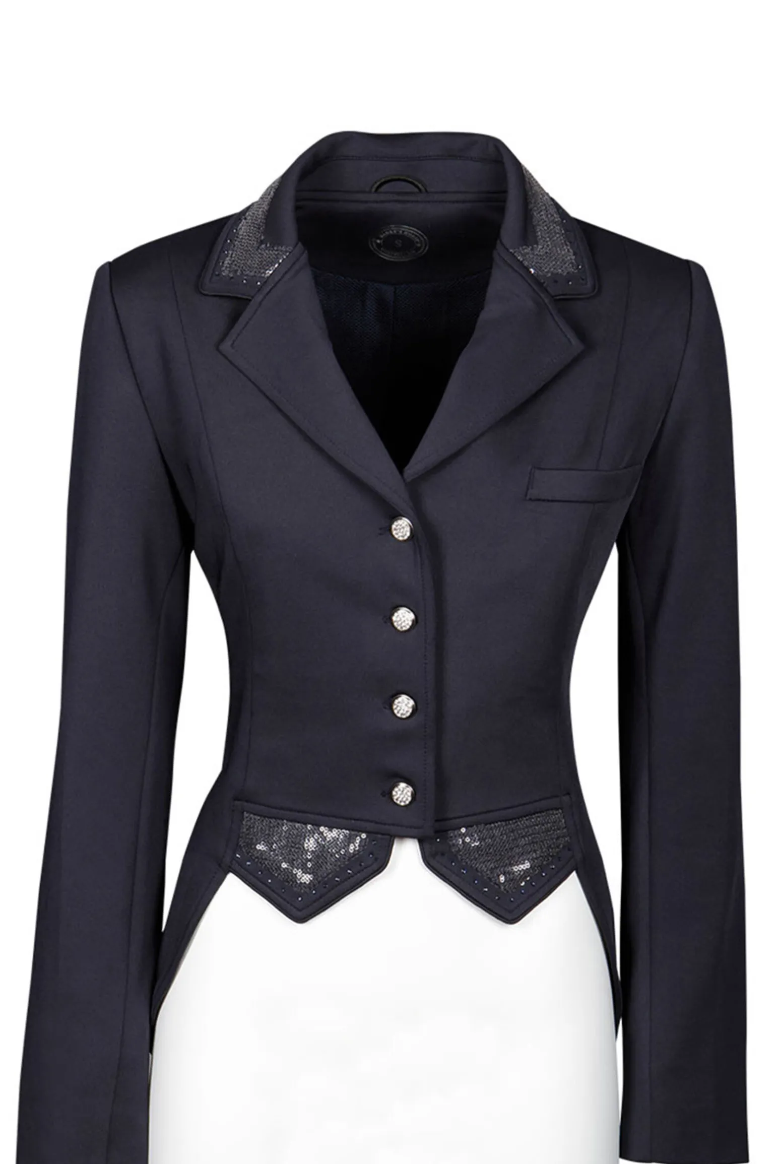 Luxury show jacket in a high quality stretch fabric. The jacket has a crystal button closure with a zip underneath for a perfect fit, the collar and vest flaps come with tone/tone sequins/crystals and piping. Ornate buttons.