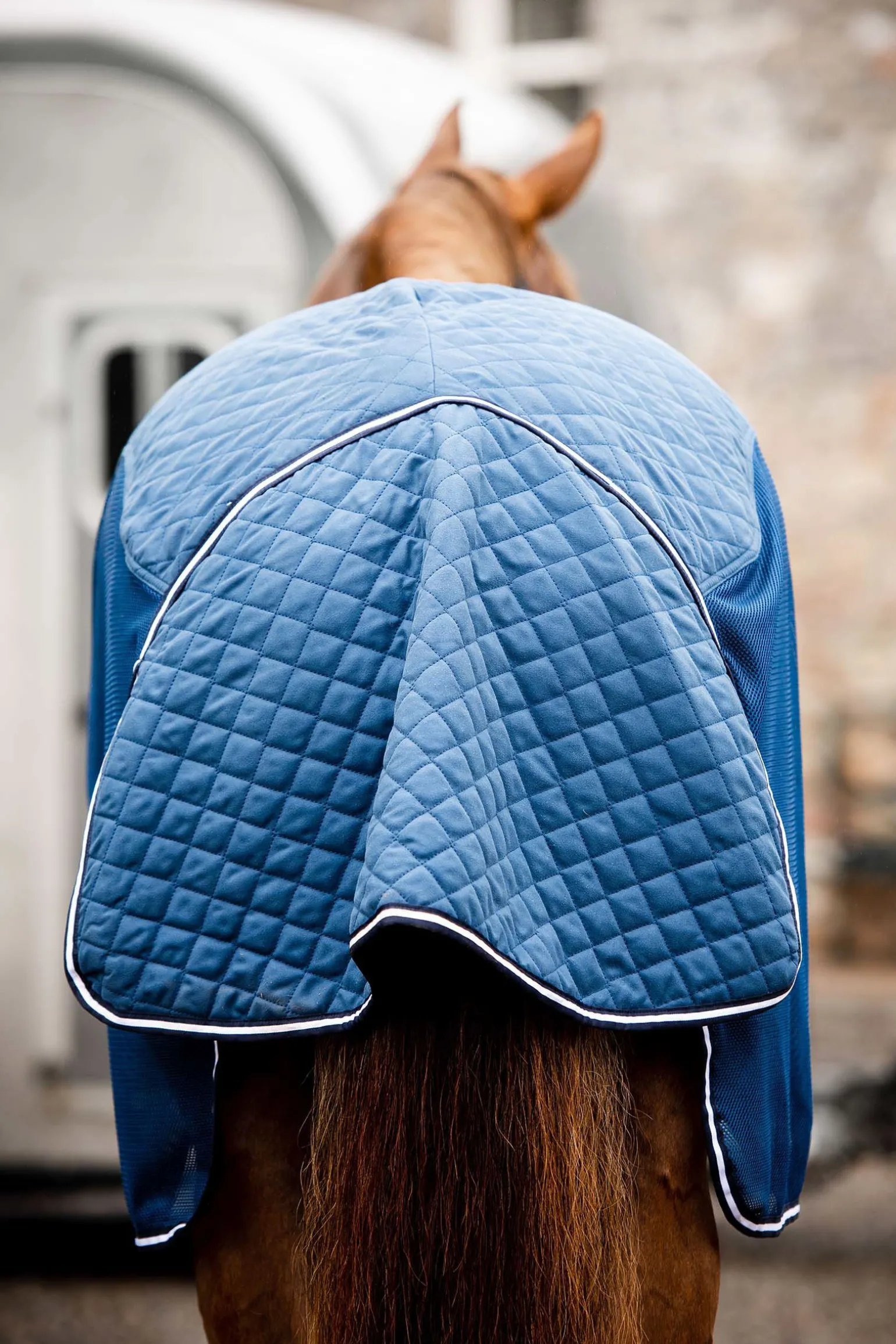 Spesielt designet for å gi den høyeste komforten for hestenUnder transport.Den formede, vatterte toppdelen gir høye fukttransporterende egenskaper, og holder nøkkelområdene varme under transport.Perforert nett på siden gir maksimal lufting for å unngå overoppheting.