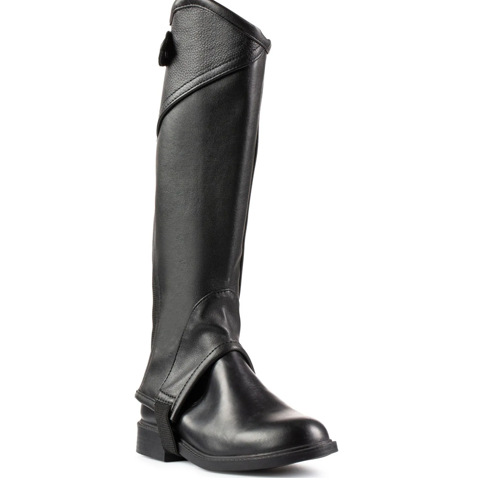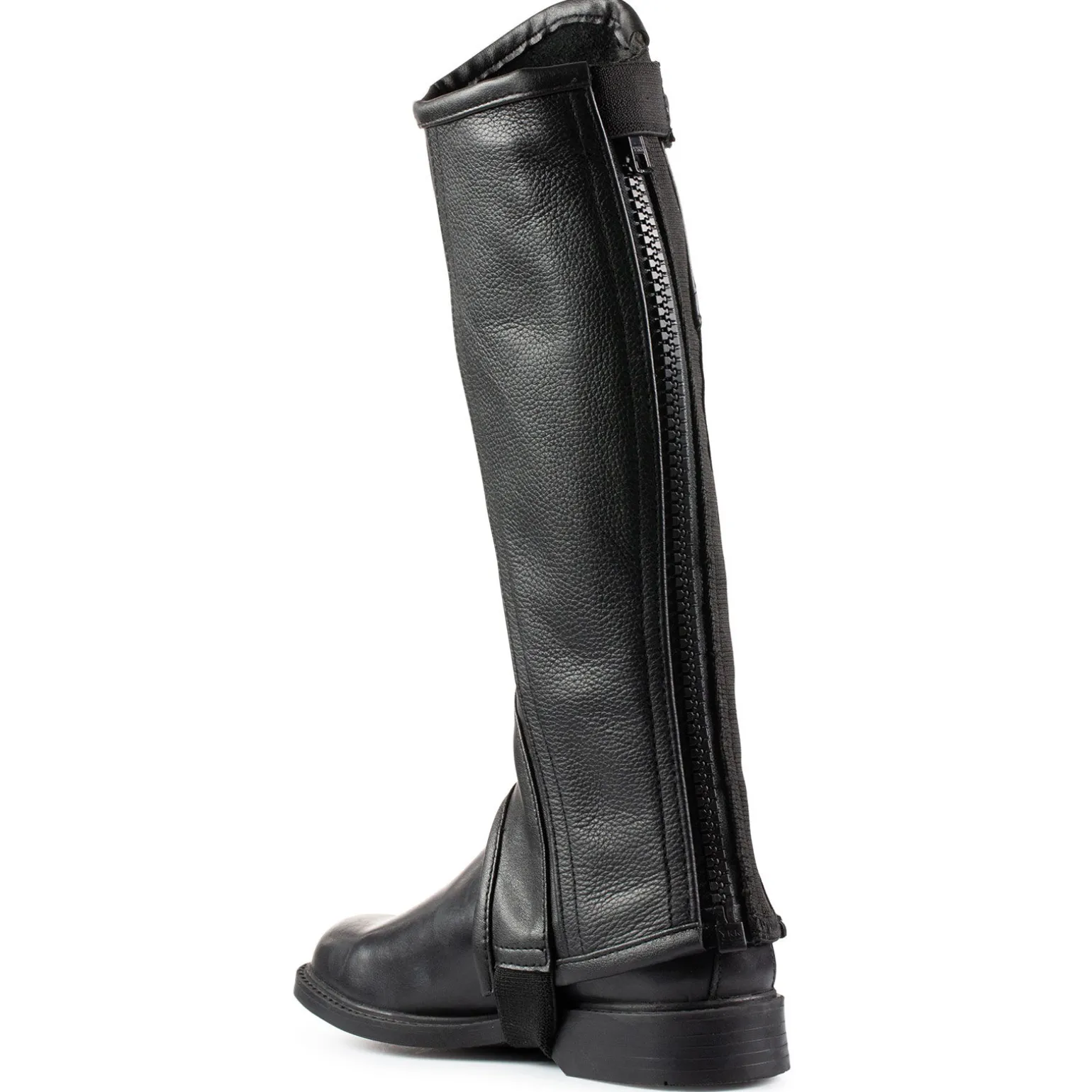 - Elastisk bånd ved foten for å holde chapsen på plass