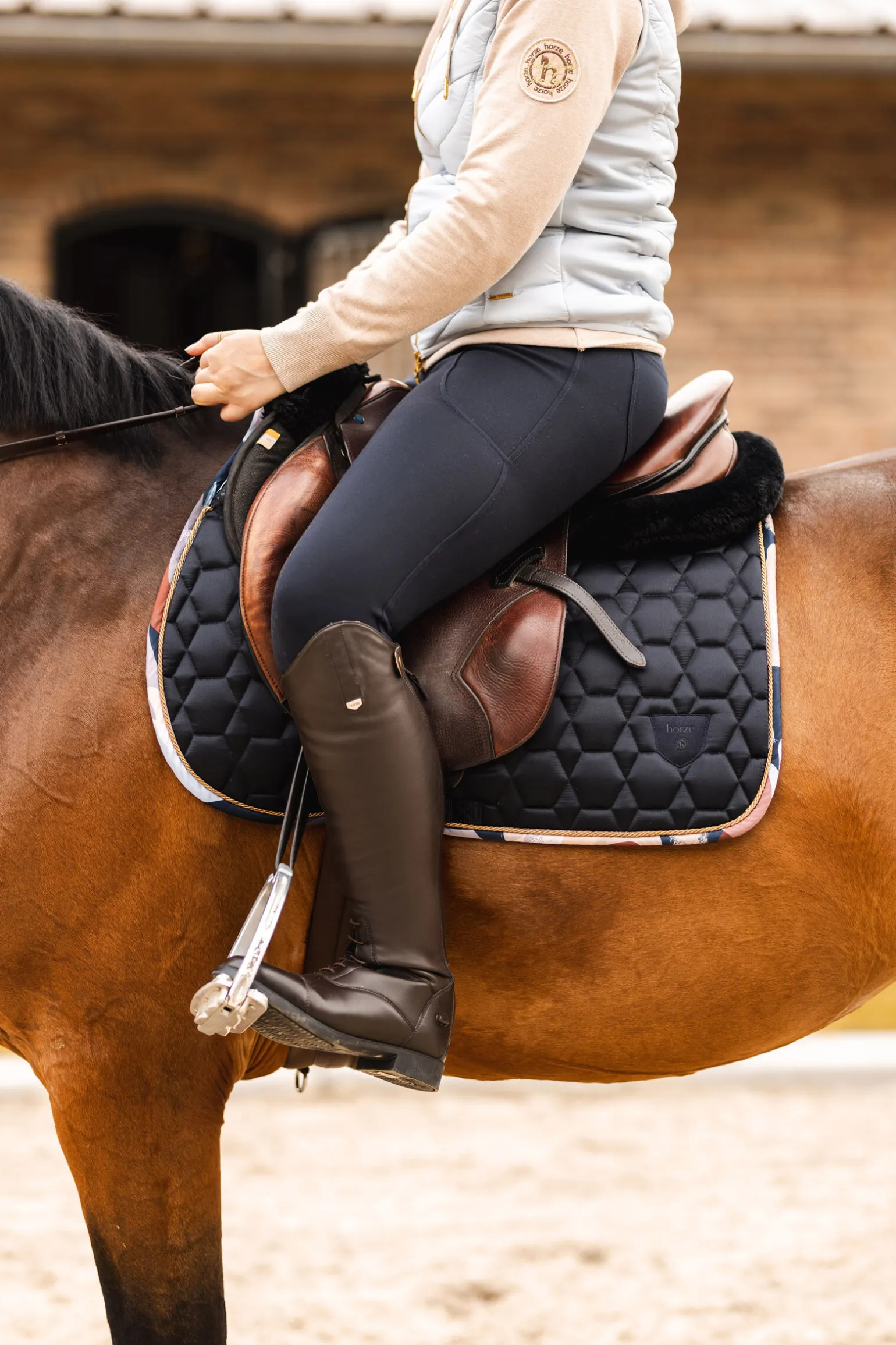 Sjabraken kommer i et sateng-lignende materiale som gir et elegant preg på hesteutstyret ditt. Det fôrede salromådet er forbedret med anti-skli silikontrykk, noe som gir en trygg og stabil passform. De justerbare gjordfestene og de lange salfestene gir et justerbart og trygt feste til salen. Det vatterte mønsteret gir et klassisk utseende, mens den fukttransporterende innsiden holder hesten din tørr og komfortabel. Med kontrastkant og Horze-logo viser denne sjabraken at den fokuserer på detaljer. Få en bedre rideopplevelse med Horze Terrazzo allroundsjabrak, en nødvendighet for alle ryttere.