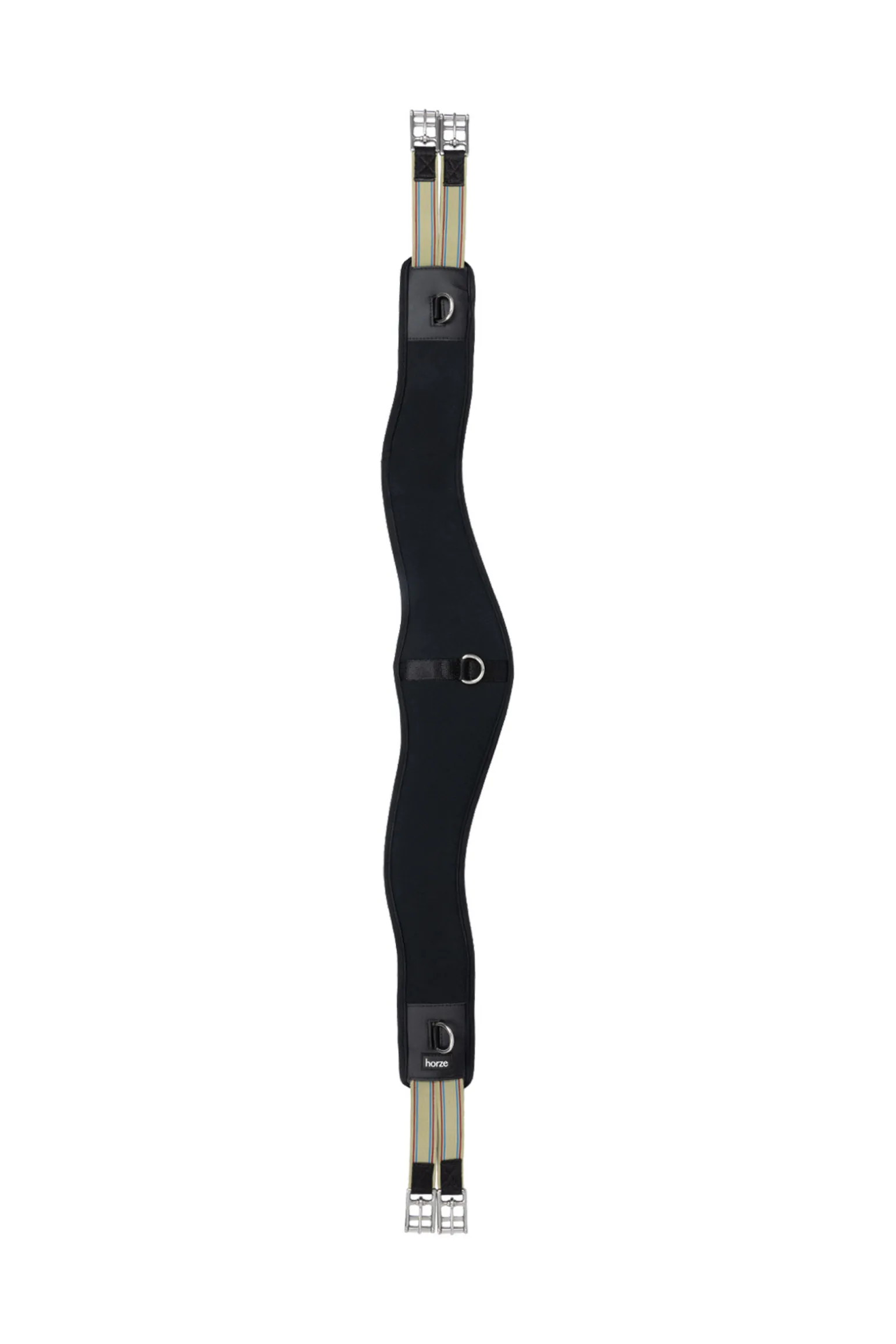 Ideal for horses with a forward girth groove, the shaped design of the Horze Wentworth long girth can help prevent the saddle from slipping forward. With internal memory foam padding and double elasticated buckle straps, the Wentworth girth is shaped for an excellent fit and offers superb comfort and freedom of movement for your horse. The internal webbing strapping reinforces for extra strength while the PU reinforcement patches offer extra protection and a durable, low maintenance design. Finishing off this super girth is the addition of 3 stainless steel D rings which allow for the easy attachment of training aids.
