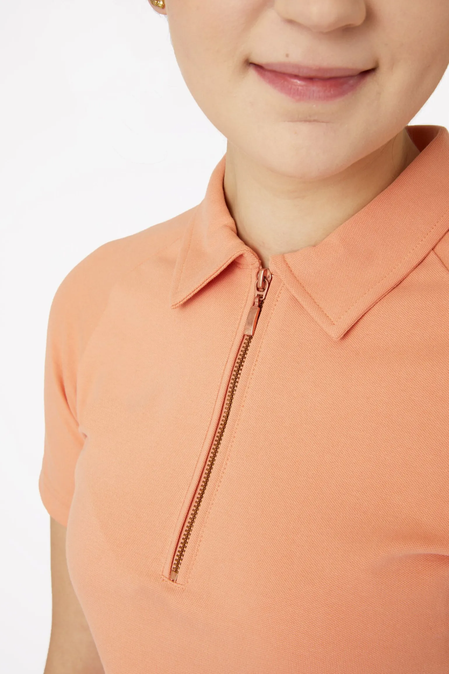 Elastisk poloskjorte med høy prosentandel bomull for en komfortabel følelse mot huden.Gummiskilt med logo på venstre arm og lite metall-merke med logo.Diskret, halv glidelås i rosegull.