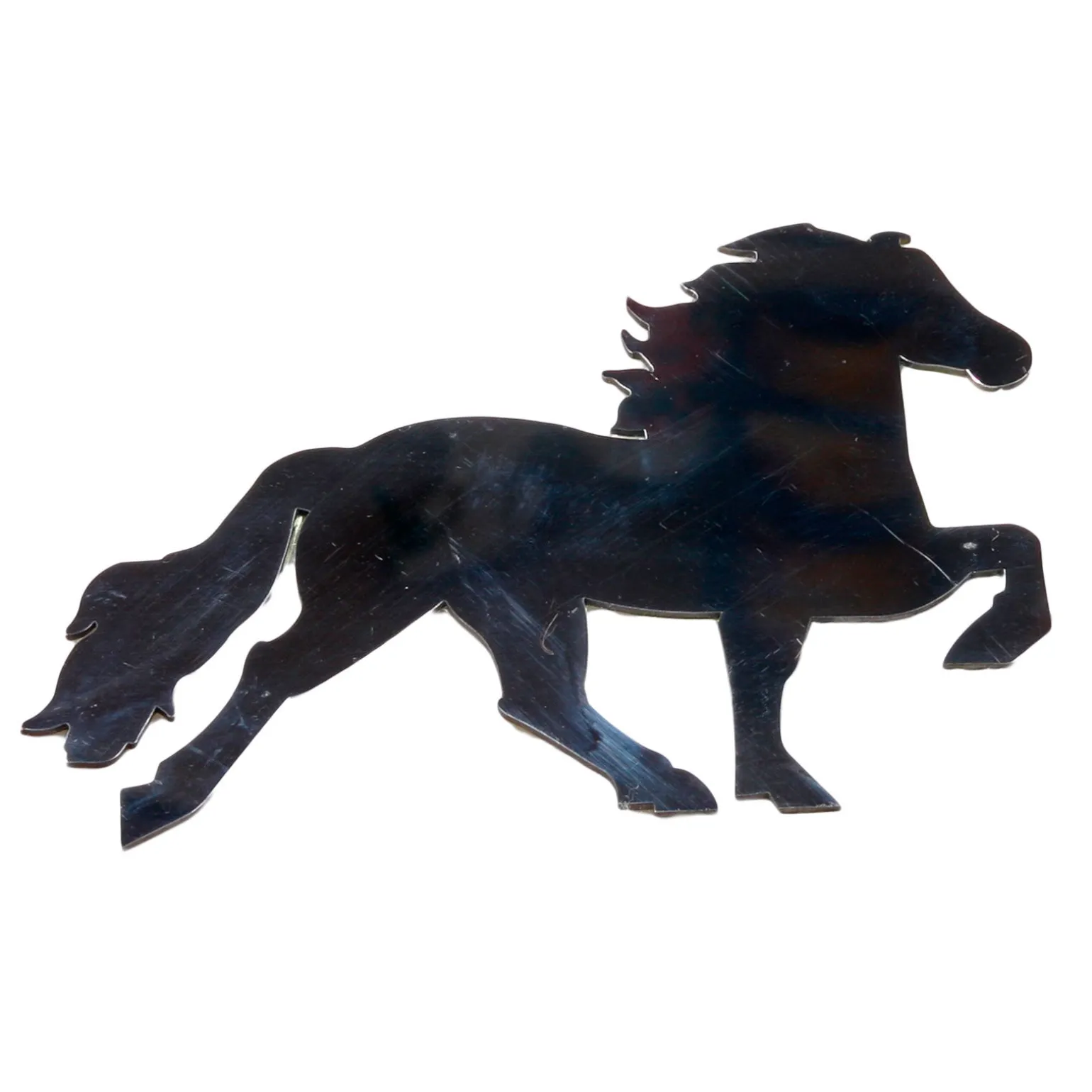 Dekorativt merke med islandshest i rustfritt stål med lim på baksiden. Kan festes på bilen eller hestehengeren.
