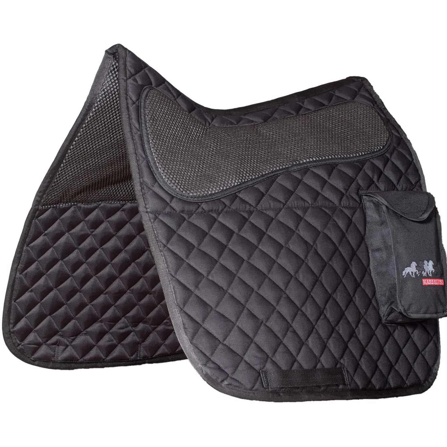 Nydelig, vattert sjabrak som gir god komfort til hestens rygg. Denne sjabraken med lommer på begge sider er perfekt å bruke hvis du skal ha med deg en grime eller en drikkeflaske på tur. Den firkantede sjabraken er formet slik at den har ekstra plass til manken.