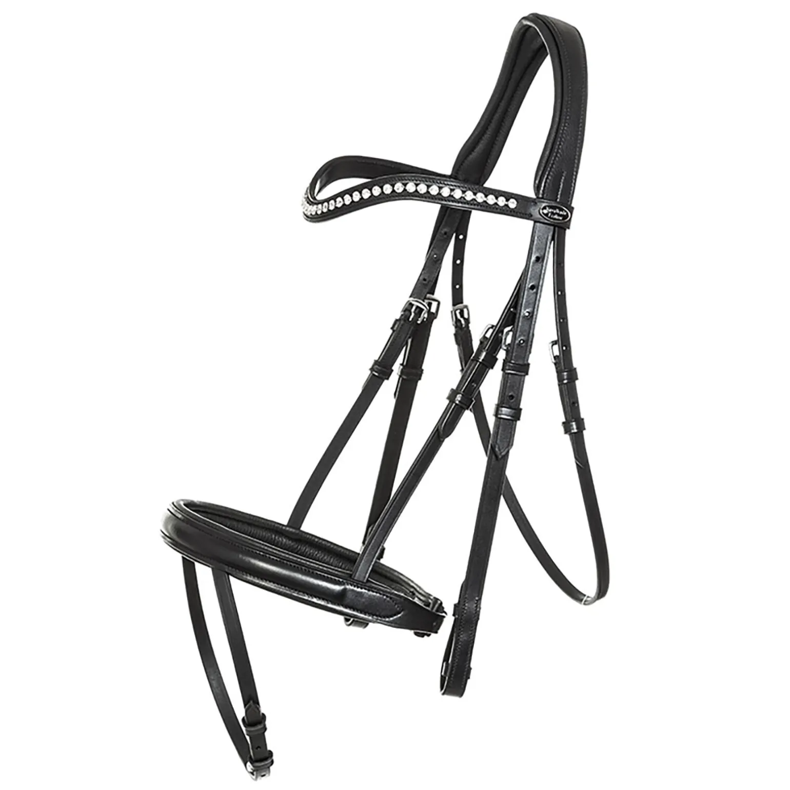 Engelsk nesereim, fast sydd. Polstret nakkestykke og nesereim. Spesiell nedre nesereim som festes på siden av neseborene og sikrer frihet til luftveiene. Ekstra bredt, buet nakkereim med frihet til ørene. Buet pannebånd med strass. Tøyler med gummi og stoppere.