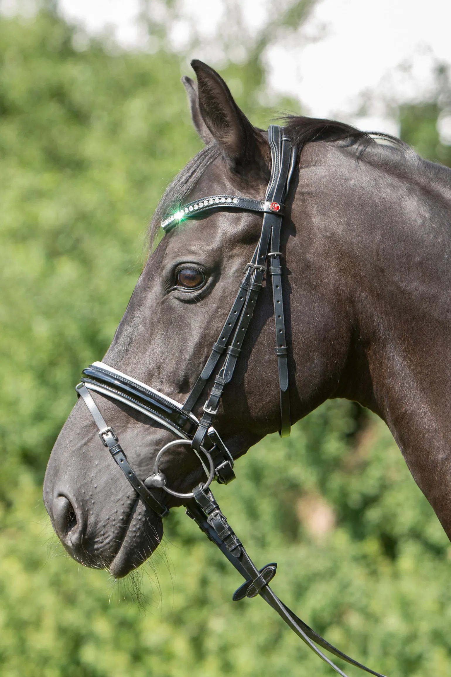 Luksuriøst hodelag med nedre nesereim, med svarte lakkdetaljer i læret.