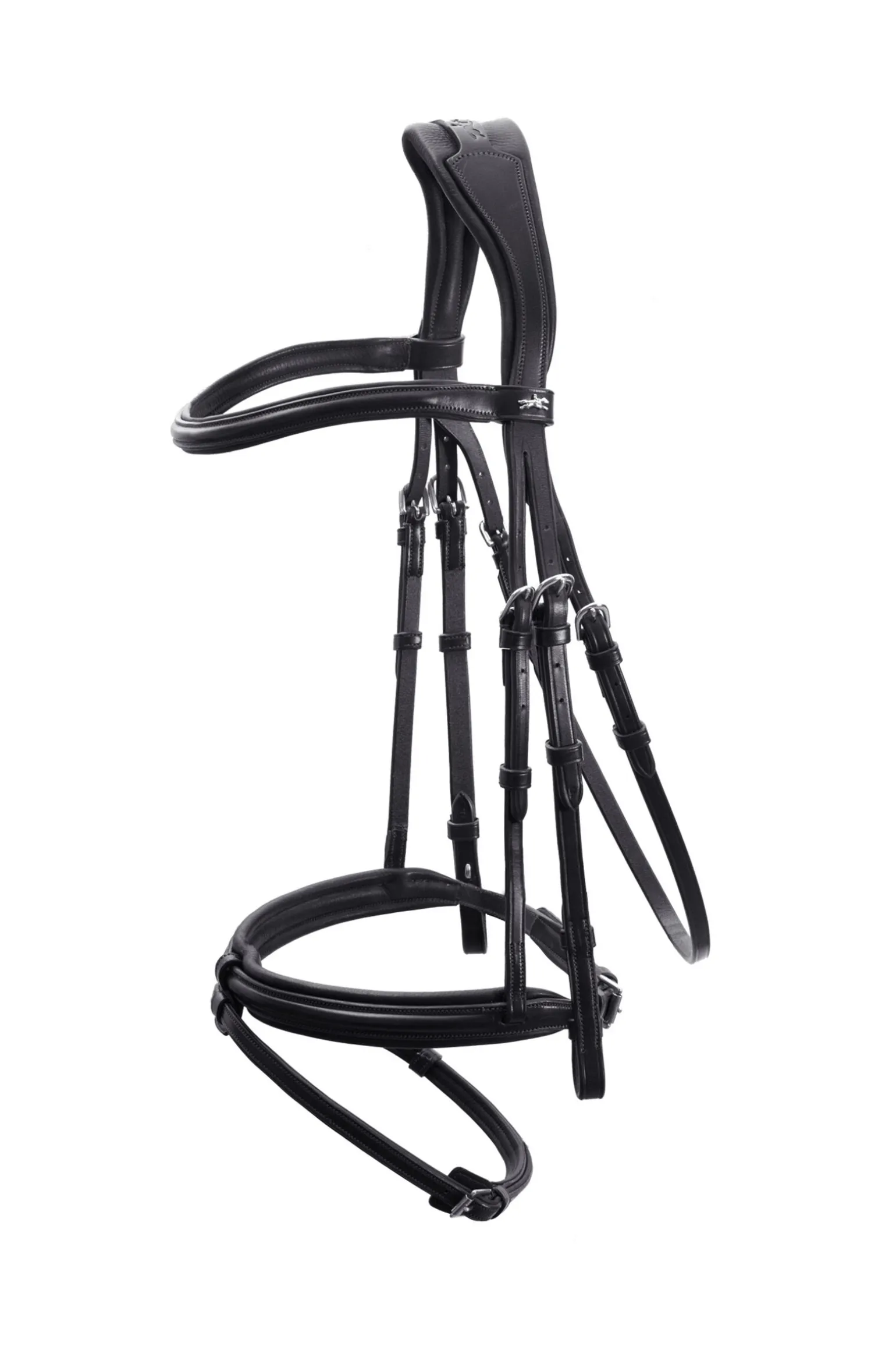 - Avtakbar nedre nesereim, polstret nedre nesereim og festehempe, buet pannebånd i lær, hakereim justerbar på begge sider, kinnstykker med innovervendte spenner