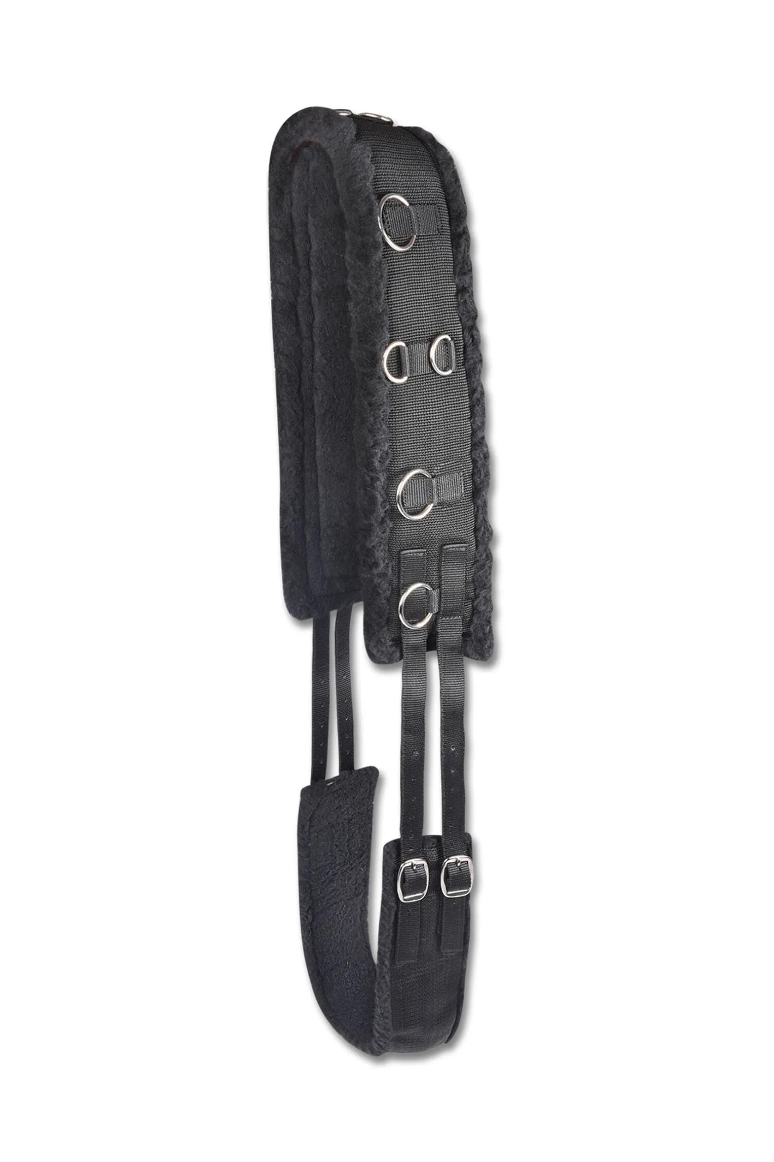 Lunging surcingle made of sturdy polypropylene, softly lined with teddy fleece. Features 12 rings for individual rein attachment.